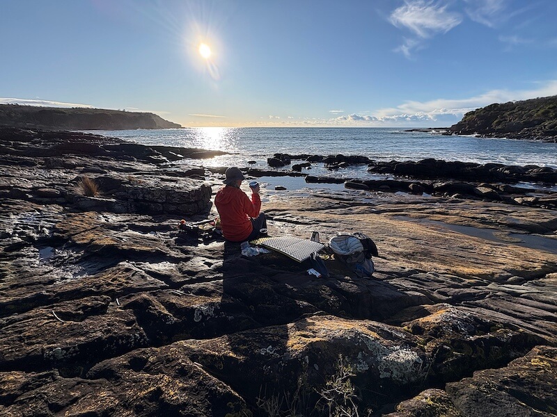 The lazy holiday rhythm of the track saw us take supplies down to the shoreline for a late breakfast and coffee by the rock pools. Morning light caught sapphire hues through the spray of the waves, making it difficult to peel ourselves away to pack up camp and start walking at a (very) leisurely 11 am. Don’t tell anyone, but this could be the ultimate chilled multi-day walk. Throw in your cossie (especially in warmer months) and you’ll quickly lose time with the swimming spots.