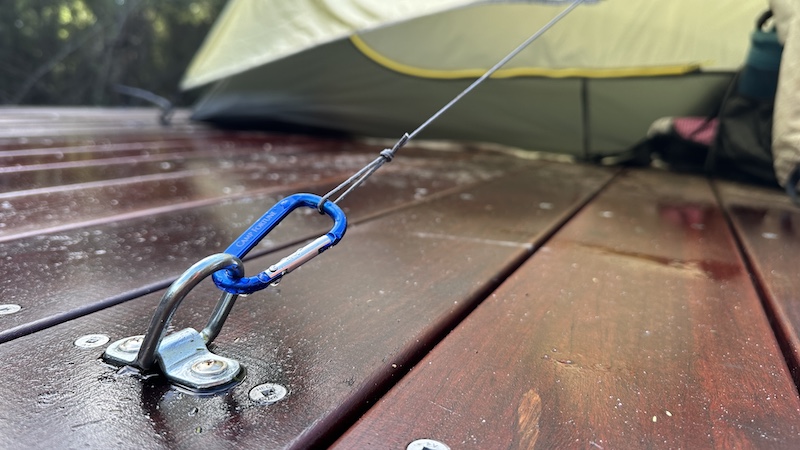 - Platforms have fixed d-rings in strategic places. Bring guy-ropes, cheap non-rated carabiners and cordage to secure non-freestanding tents