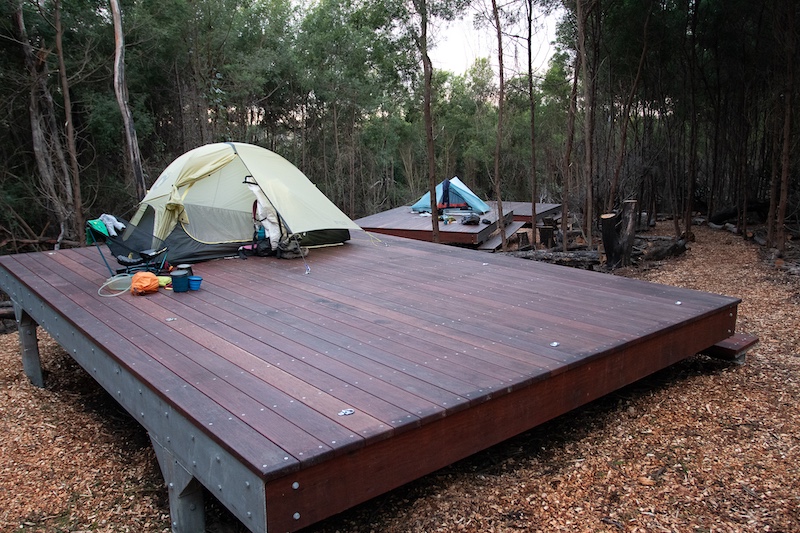 Buoyed by the approach of an early golden hour, we arrive at the thickly forested tea tree glade of Hegartys Campground, the second of the new walk-in sites. The familiar tent platforms feel like they’re being hugged by encroaching melaleuca and she-oak on all sides. Here, it is only the gentle, ever-present waves lapping on the rocky shore that hint at how close we are to the coast.