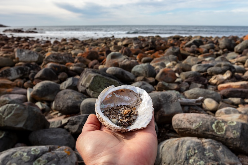 Leather Jacket Bay’s smooth, rounded rocks, just 5km from the start, are perfect perches for lunch. A lone abalone shell, the first of many, glowed under the dormant sky as nearby NPWS field staff enjoyed a break from the final touches of the upgrades.
