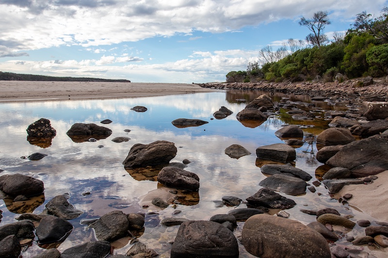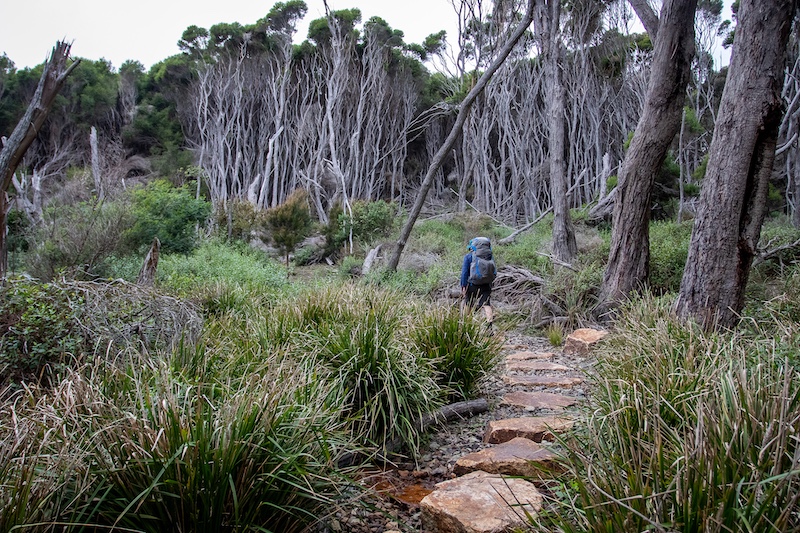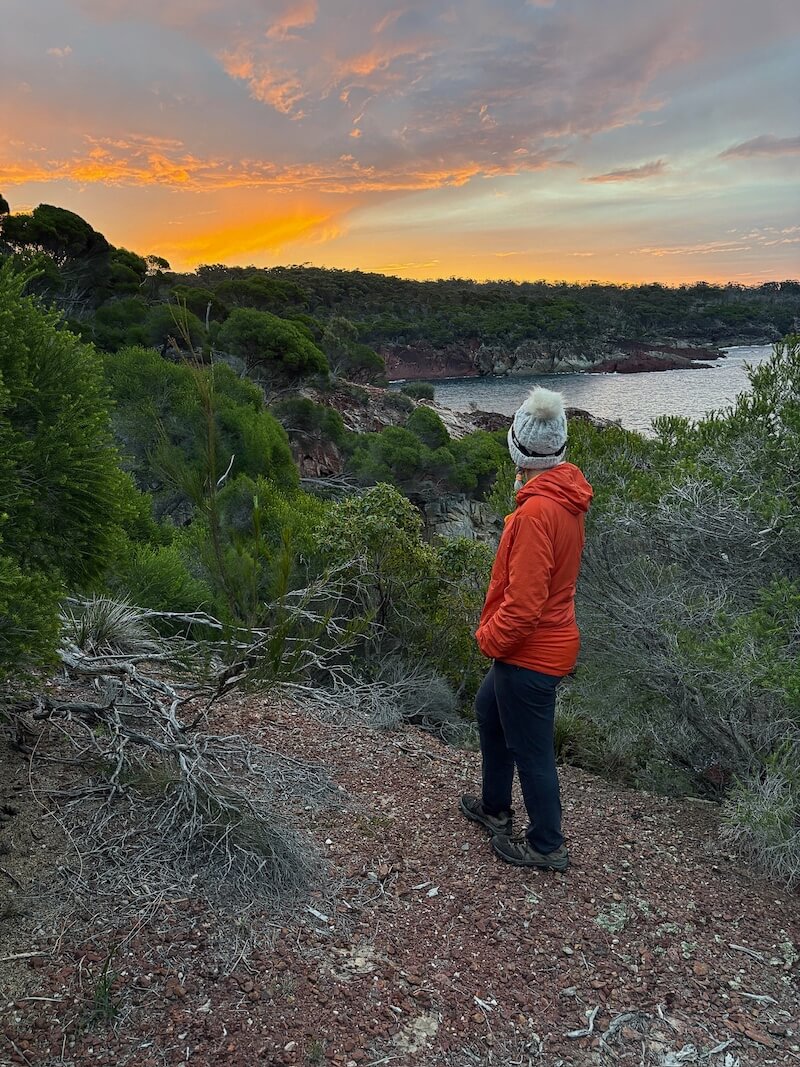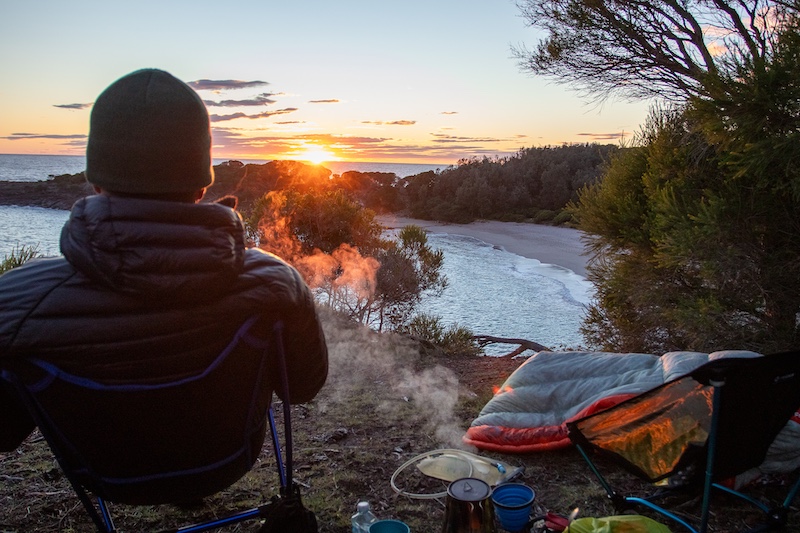Buoyed by the approach of an early golden hour, we arrive at the thickly forested tea tree glade of Hegartys Campground, the second of the new walk-in sites. The familiar tent platforms feel like they’re being hugged by encroaching melaleuca and she-oak on all sides. Here, it is only the gentle, ever-present waves lapping on the rocky shore that hint at how close we are to the coast.
