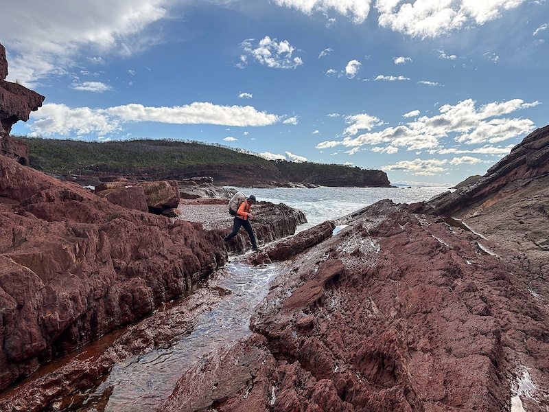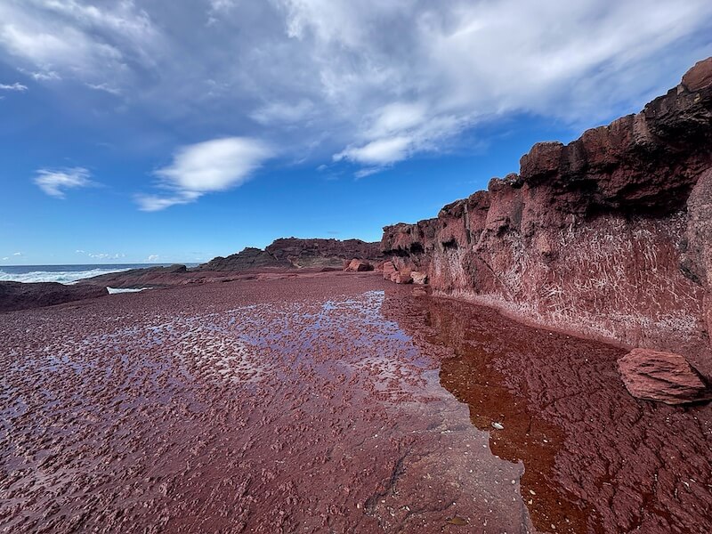 Turquoise waters greeted us on Mowarry Beach, starkly contrasting the dramatic Devonian red rocks, laid down 360 million years ago. Sea cliffs betrayed the uplifted folds of geological time, as layers rolled in on themselves, like a sea serpent trapped inside.