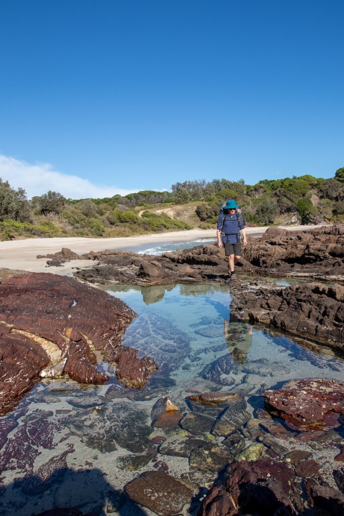 The lazy holiday rhythm of the track saw us take supplies down to the shoreline for a late breakfast and coffee by the rock pools. Morning light caught sapphire hues through the spray of the waves, making it difficult to peel ourselves away to pack up camp and start walking at a (very) leisurely 11 am. Don’t tell anyone, but this could be the ultimate chilled multi-day walk. Throw in your cossie (especially in warmer months) and you’ll quickly lose time with the swimming spots.