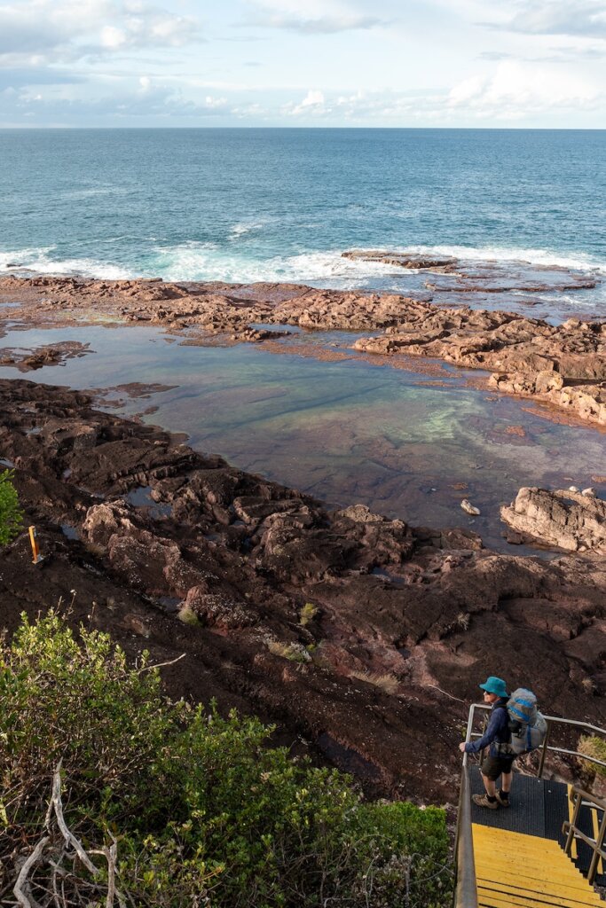 The longest of the 3 days, my quads are starting to feel it as Greencape Lighthouse, the 2nd of our Two Towers, comes into view. The greater elevation change (approximately 480 metres ascent over the day) is thanks to the commitment of keeping the track to the edge of Australia. NPWS achieved this with a series of new steel staircases that yo-yo us down to rockpools and back up to each headland above. (TIP: If you leave some fuel in the tanks for the last 3 km, you’ll thank me.)