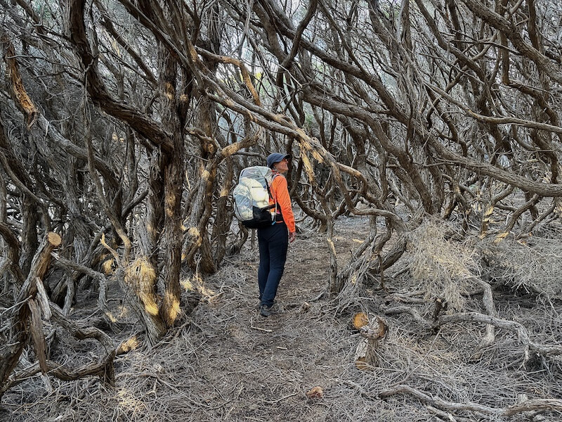 Instantly, we are transported into a tunnel of tea tree (bracelet honey myrtle), the most dominant of the coastal heath vegetation we encountered. Gangly, wiry-like branches bowed overhead, creating eerie moments as we passed. It felt like faeries or even Tolkien’s Ents or Treebeard were quietly watching us.