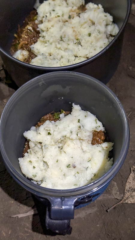 Night two: I made a dehydrated Shepherd’s Pie based on a Recipe Tin Eats recipe (thanks Nagi), switching out for dry sauce ingredients (20g) plus Campers Pantry pulled beef (56g) and Campers Pantry cheesy chive mash (90g). I prepped enough for two serves as I was sharing food duties with my walking buddy—dividing meal prep is a smart way to reduce pack weight and cooking gear between mates.