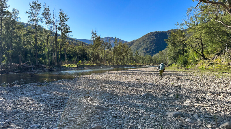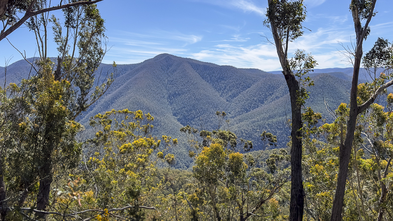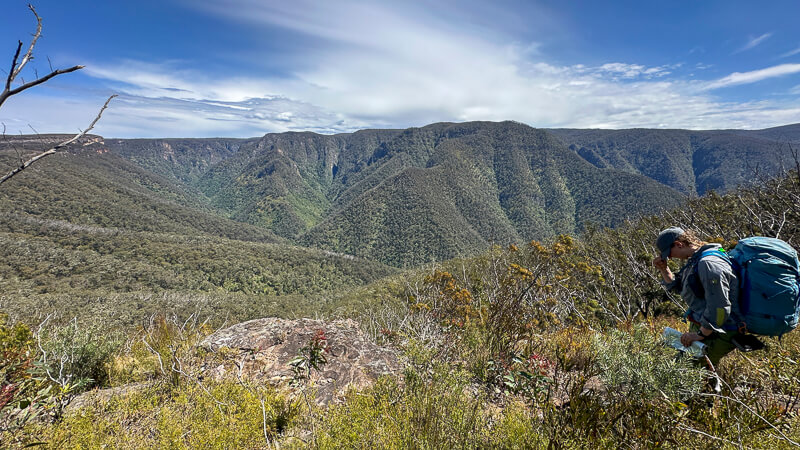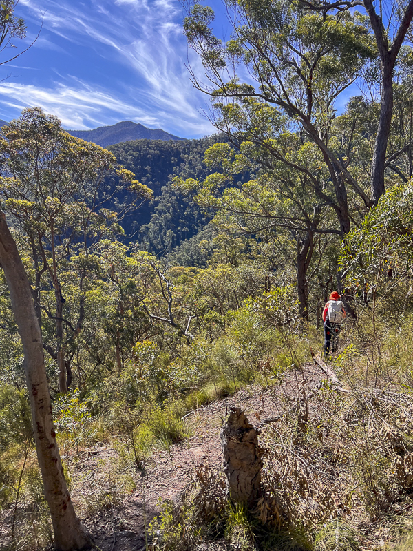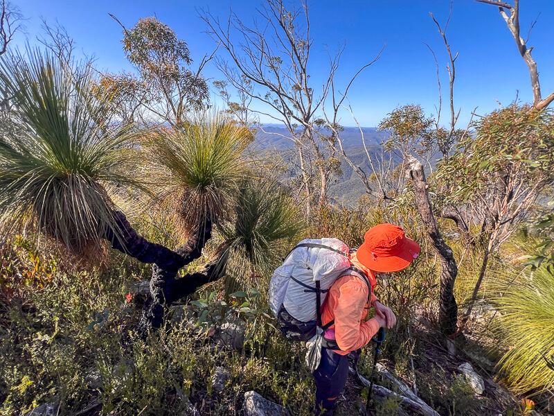 The park suffered badly in the 2019-2020 bushfires, and the regrowth has completely obliterated many of the old routes and tracks. I knew I needed to pack light because the elevation gain and loss over four days was substantial—around 3,000 metres of ascent AND descent was ahead of us. The thick regrowth meant serious scrub-bashing (full-body armour would be handy, but it doesn’t pack light). It was October, with forecasts hitting 24-26°C+, which meant some hot, exposed climbs on spurs that lost their shade in the fires. Light pack or suffer—those were my options. What we found, was that the forecast temps felt much higher in the dry, exposed spurs and ridges. My recommendation is not to attempt anything big out there if it’s likely to be >26c.